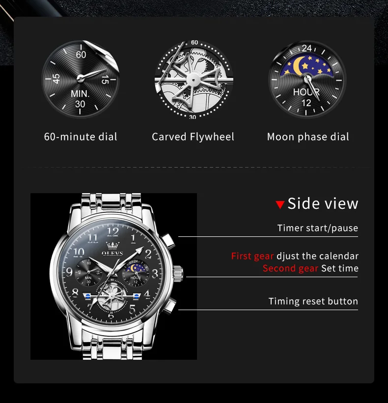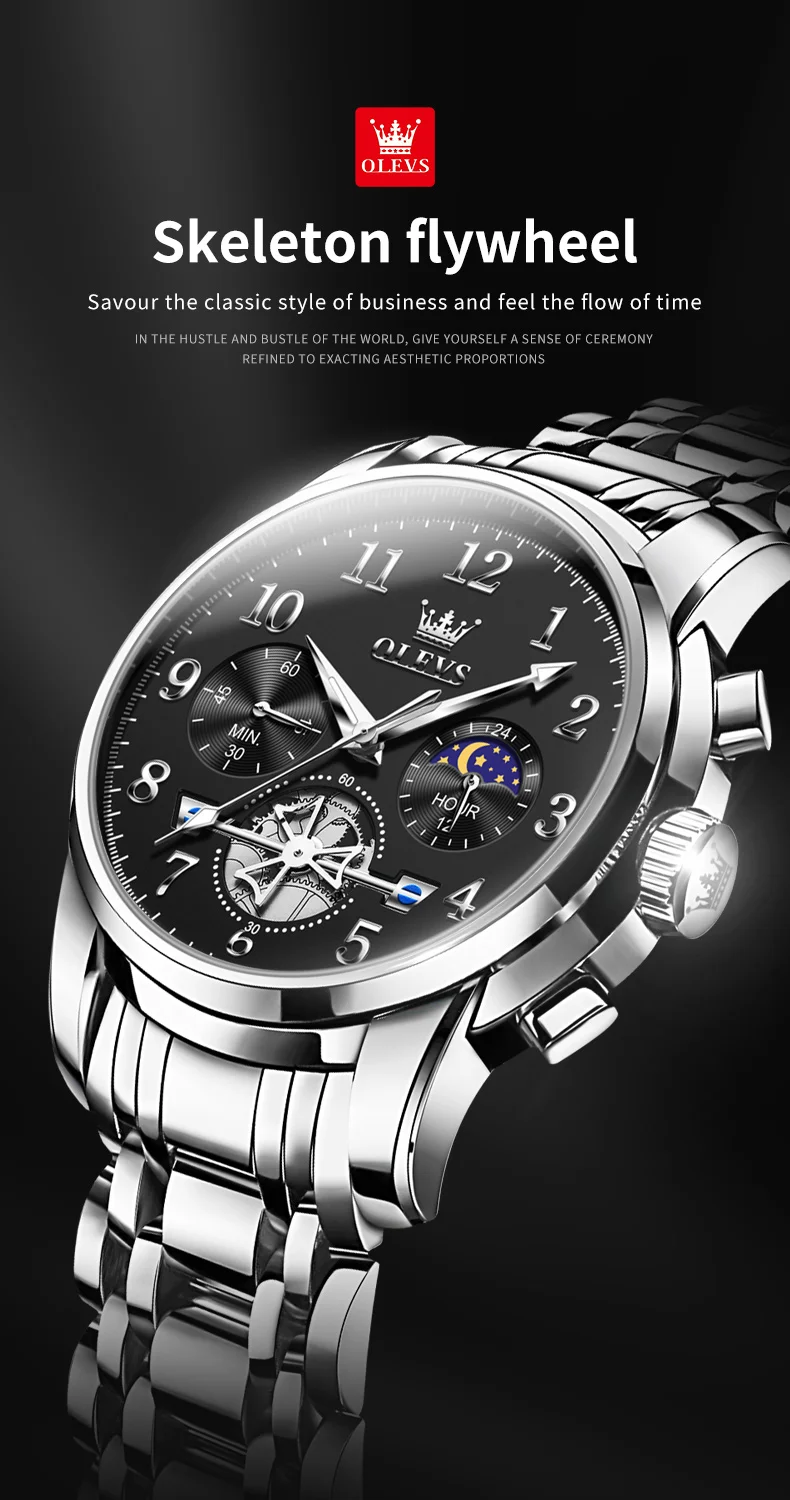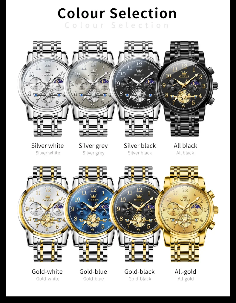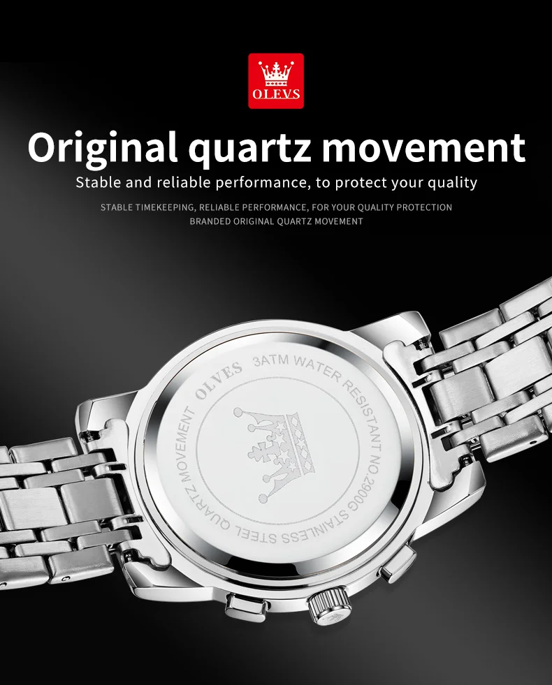 The OLEVS 2900 delivers elegant craftsmanship with a modern edge. Featuring a moon phase display, luminous dial, and stainless-steel band, this multifunctional quartz watch blends luxury and performance. Waterproof and durable built for business, style, and everyday wear.