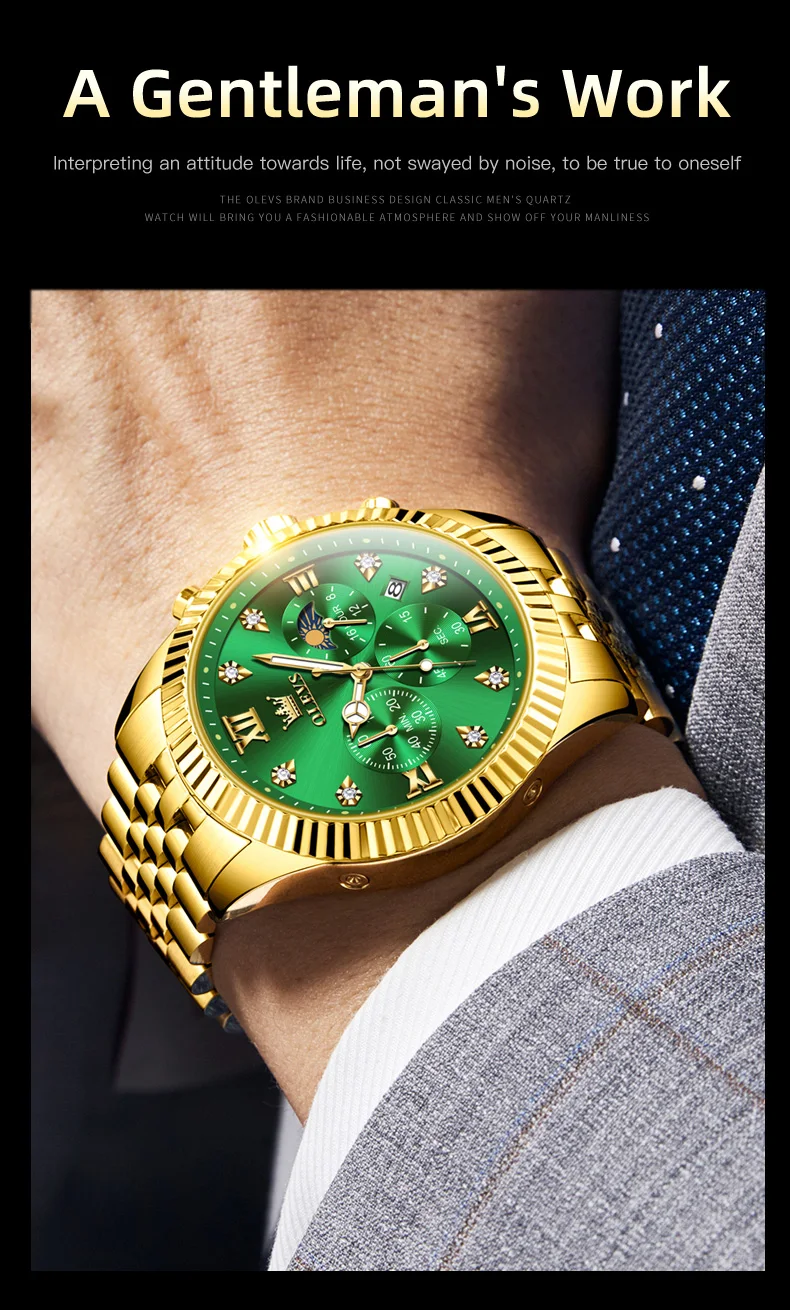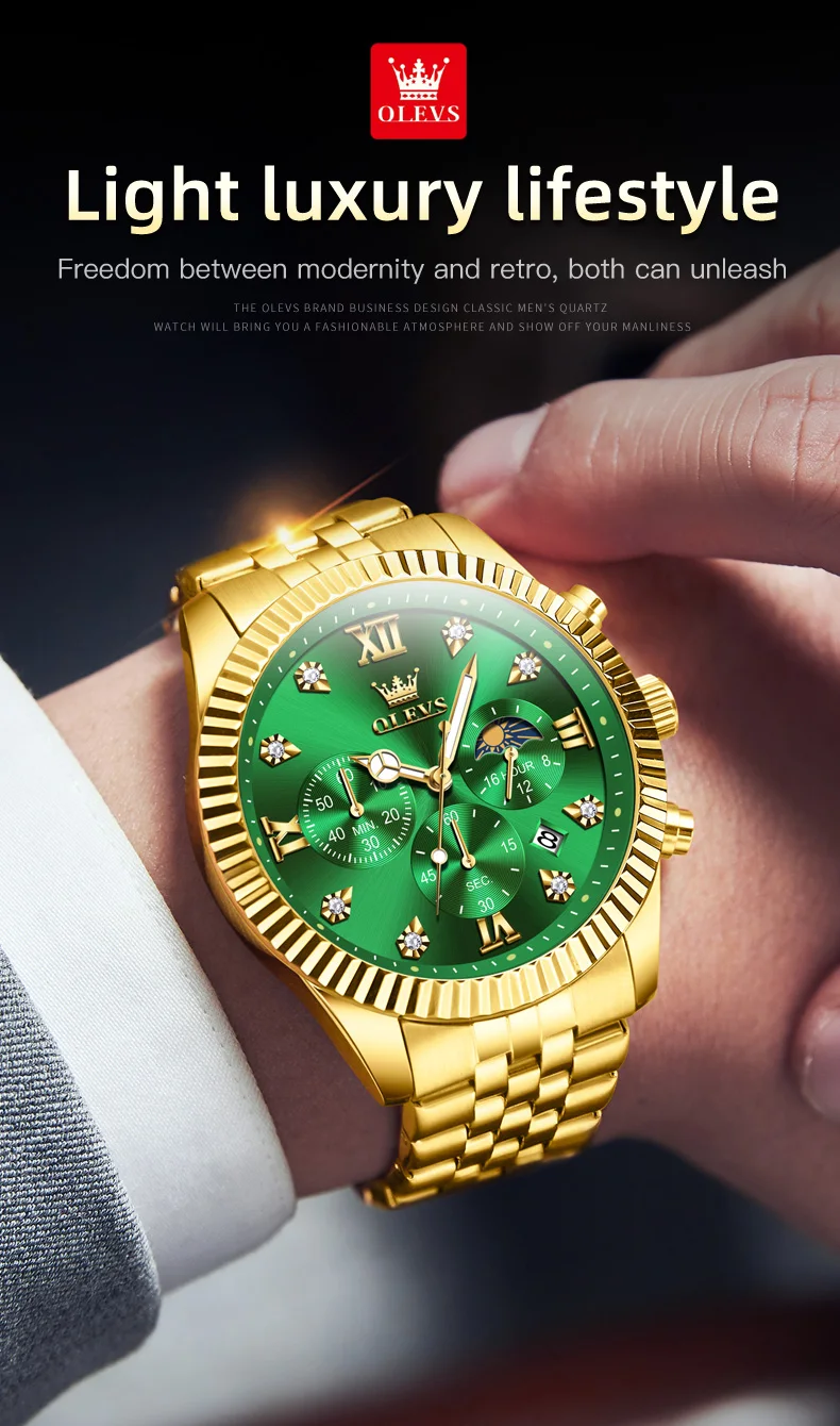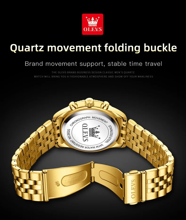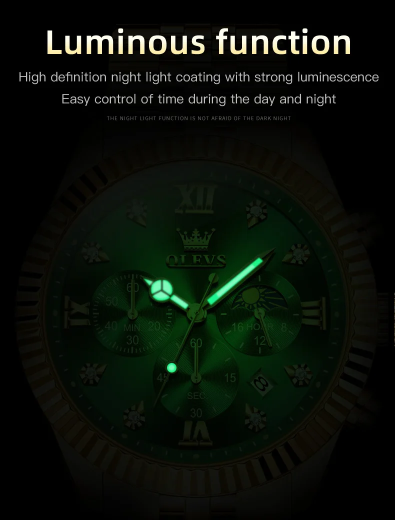 The OLEVS 2932 delivers a bold and refined style. Designed with a stainless steel case, luminous hands, and diamond-accented chronograph dial, it combines luxury and performance. Powered by precise quartz movement and water-resistant up to 3BAR, this watch is perfect for business, sport, or daily wear.