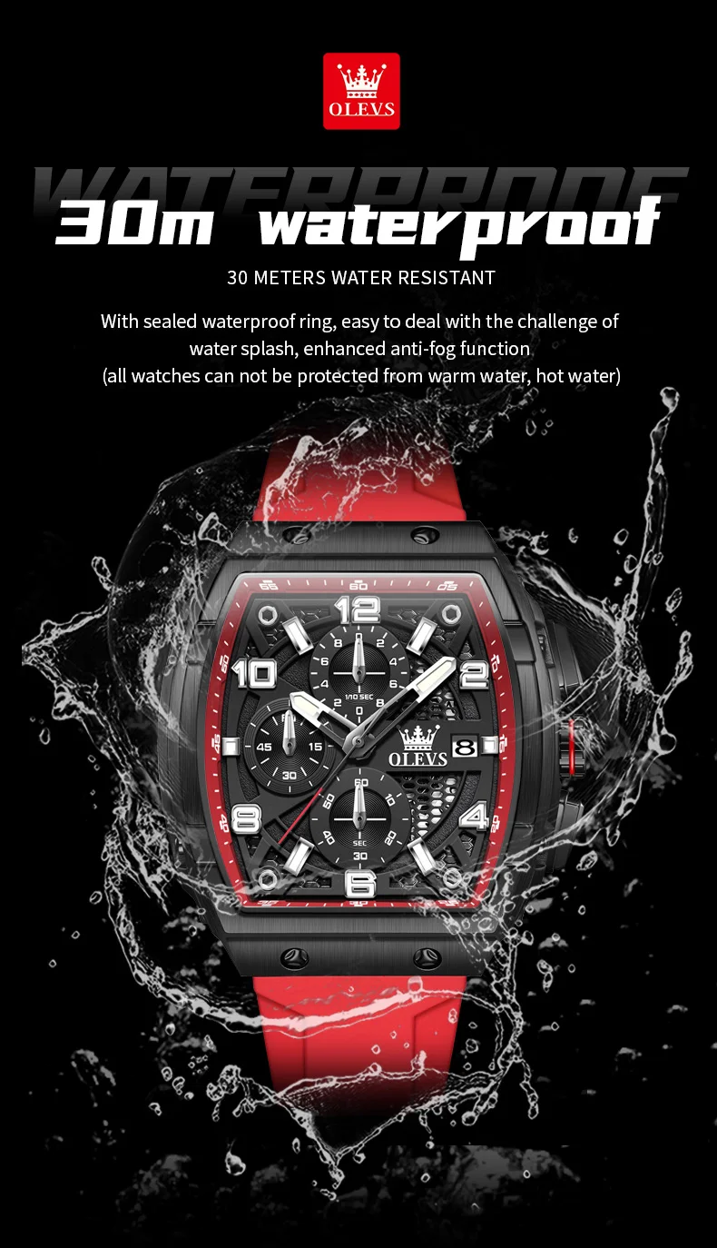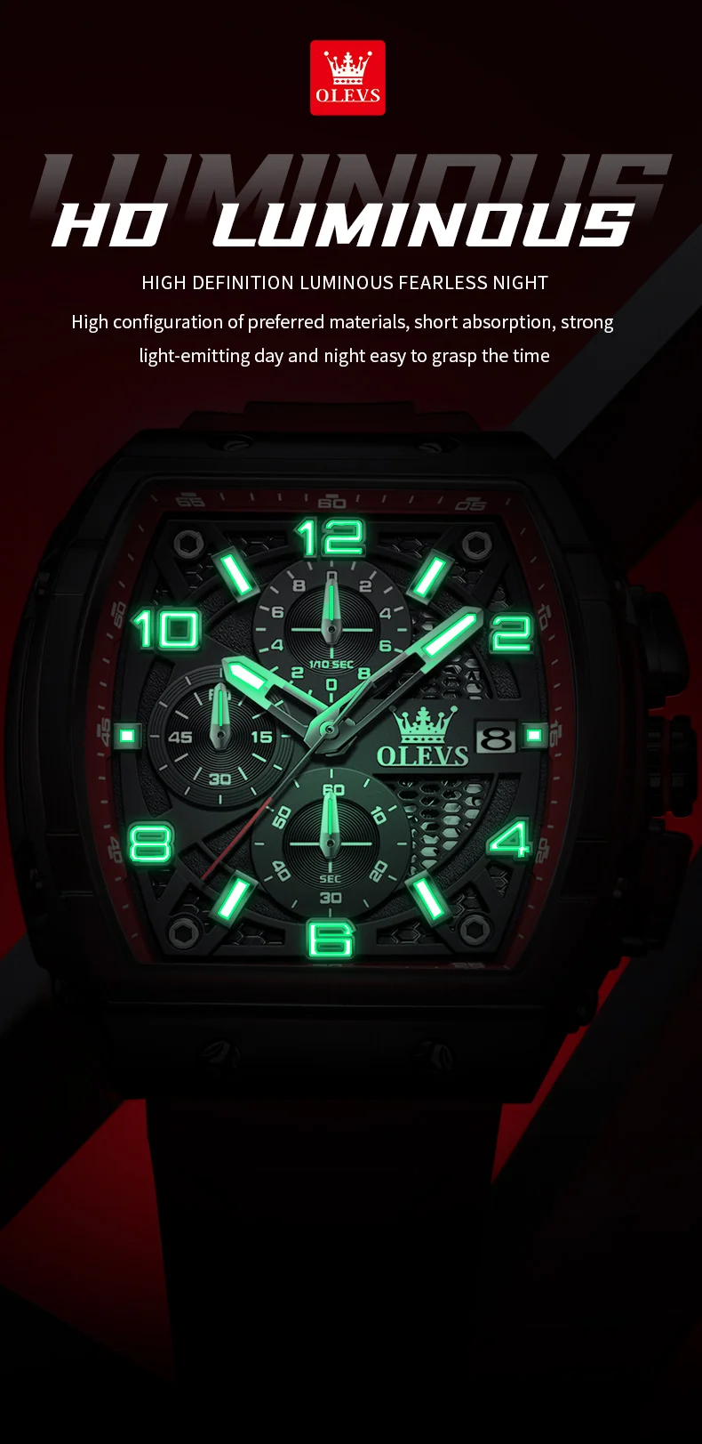The OLEVS 2976 is a luxury men’s chronograph quartz watch combining sporty aesthetics with precision performance. Featuring a six-pin multi-function display, luminous dial, and durable silicone strap, it offers both elegance and everyday wearability.