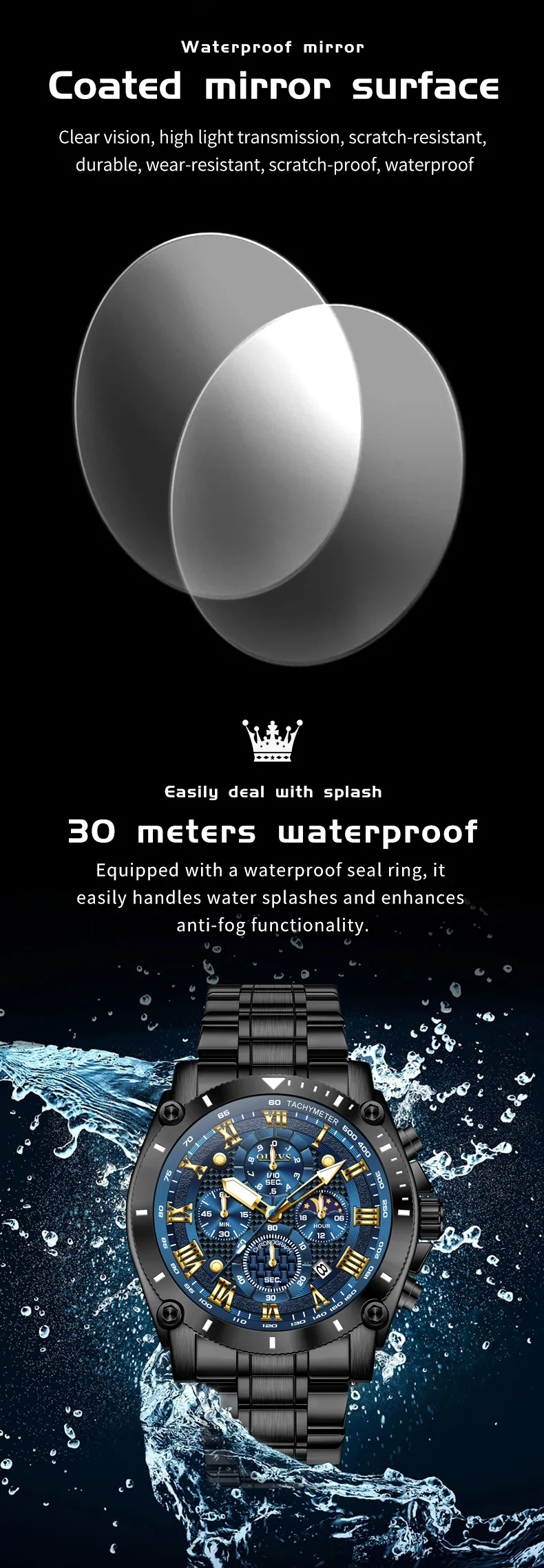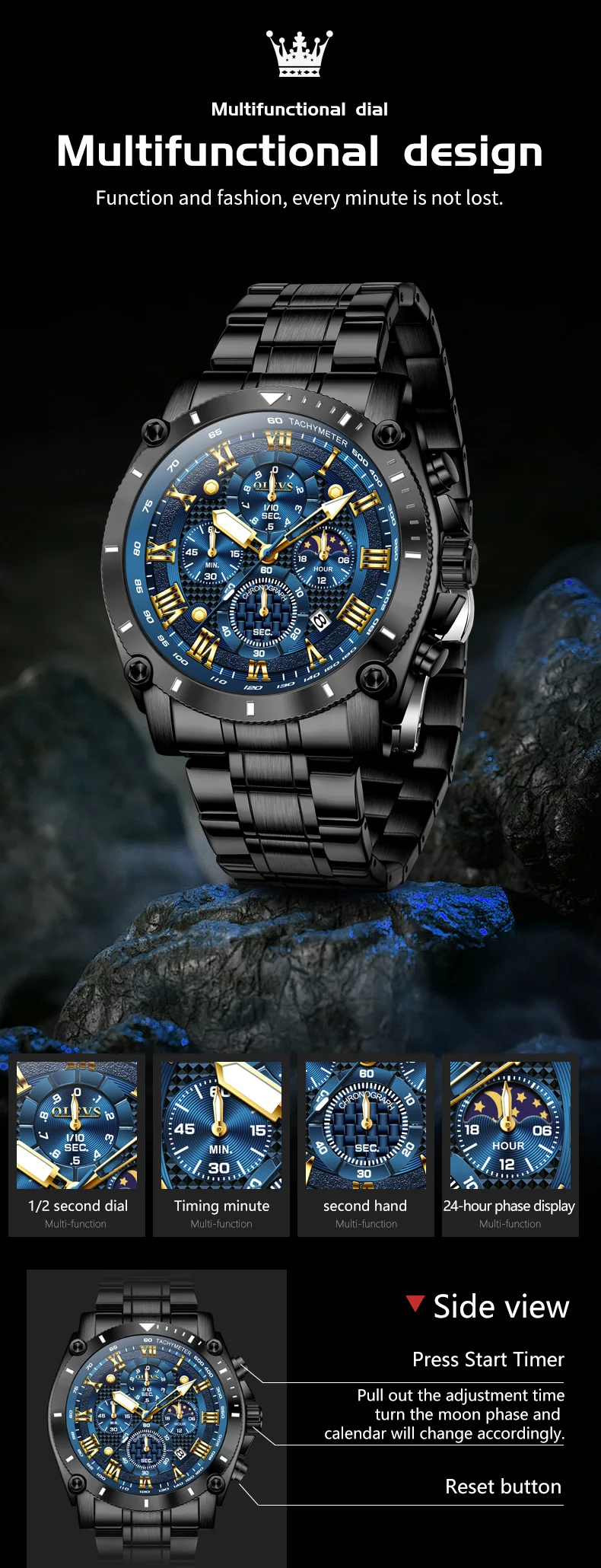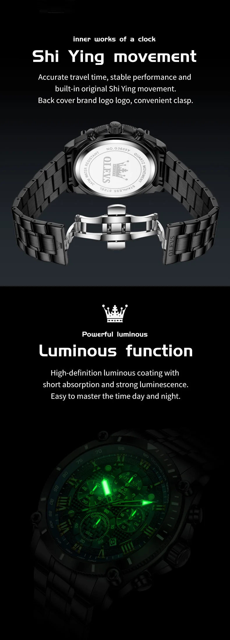 The OLEVS 3689 Real Three-Eye Men’s Watch blends business elegance with sporty performance. Featuring a functional chronograph design, durable stainless-steel strap, and waterproof alloy case, this watch delivers both precision timing and luxury appeal — perfect for everyday wear or formal occasions.