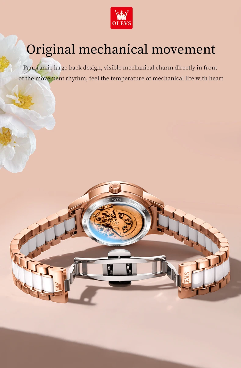OLEVS 7074 showcases timeless elegance with a hollow dial design, luminous markers, automatic mechanical movement, and a ceramic-accented stainless steel bracelet.