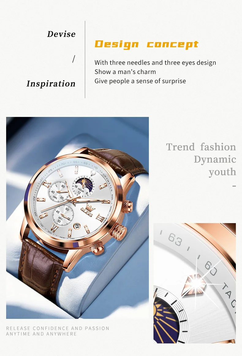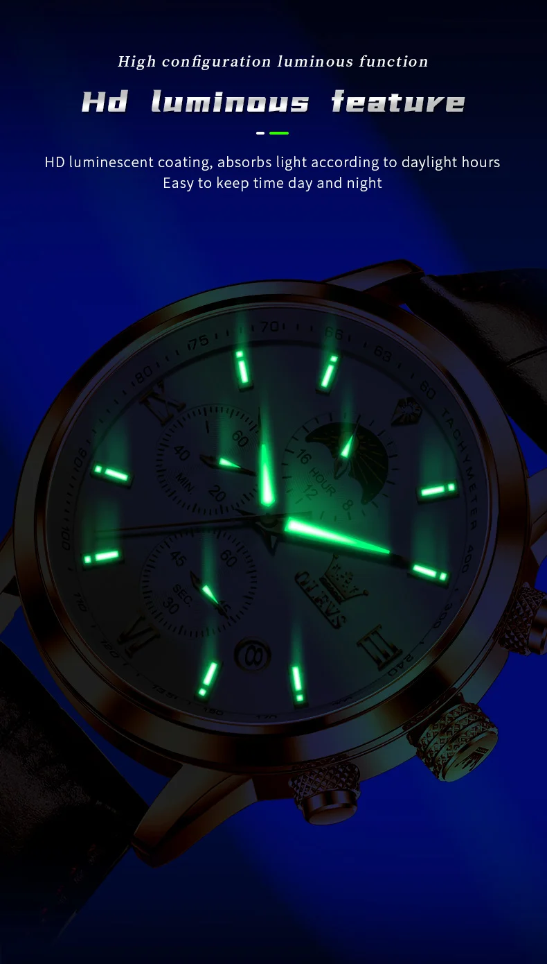 The OLEVS 9812 blends classic elegance and modern craftsmanship. This men’s quartz watch features a moon phase display, chronograph function, and premium leather band — ideal for business and formal occasions. Waterproof up to 3BAR for everyday wear