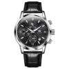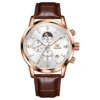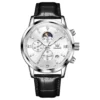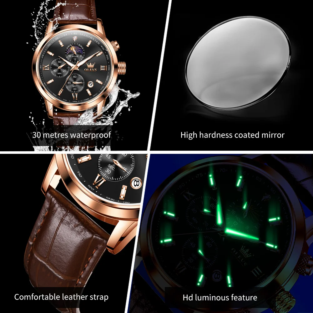 The OLEVS 9812 blends classic elegance and modern craftsmanship. This men’s quartz watch features a moon phase display, chronograph function, and premium leather band — ideal for business and formal occasions. Waterproof up to 3BAR for everyday wear